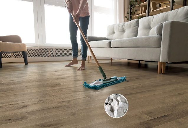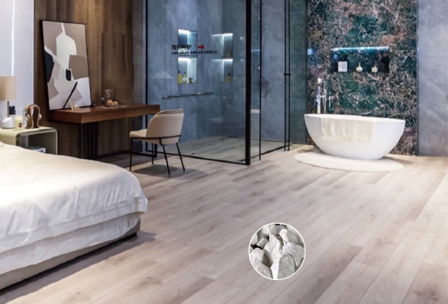 乐迈石晶新型环保材料的优点,其核心来自于它的基材。它的主原料为广泛分布于地球各地的天然石灰岩(成分为碳酸钙),在生产时将它与树脂晶体材料进行混合,通过挤出机以一定的高温和压力一体挤出成型,全程无需添加任何胶水。