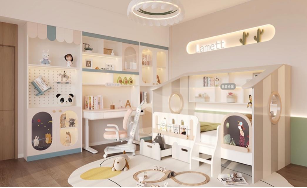 Lamett乐迈石晶儿童家居创意空间从健康出发,通过“零醛添加、防霉防菌、超越国际标准、满足不同成长阶段需求、创新主题设计、创新儿童友好生活方式”等优势,推出“林间探险家”、“星际穿越”等六大主题系列产品,满足孩子不同成长阶段对居家空间的多样化需求,一站式定制孩子的专属创意空间。