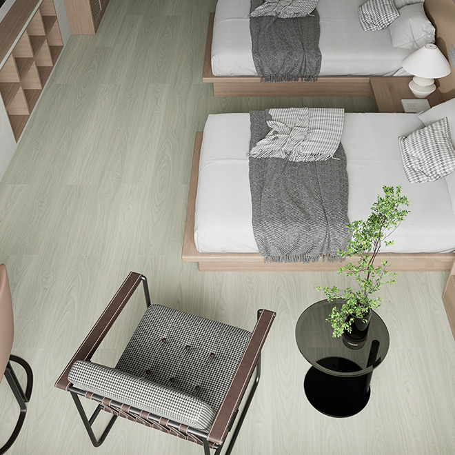北欧针叶林的初霜,在夜里悄悄镀上一层薄银。霜地把这份清冽的冷光凝进木纹,灰底中泛出微微冰蓝,让盛夏也能听见雪落的声音,为空间带来透彻的呼吸感。